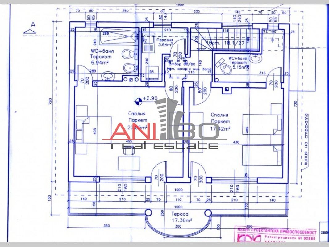 Втори етаж: две големи спални със собствена баня със санитарен възел и тераса.