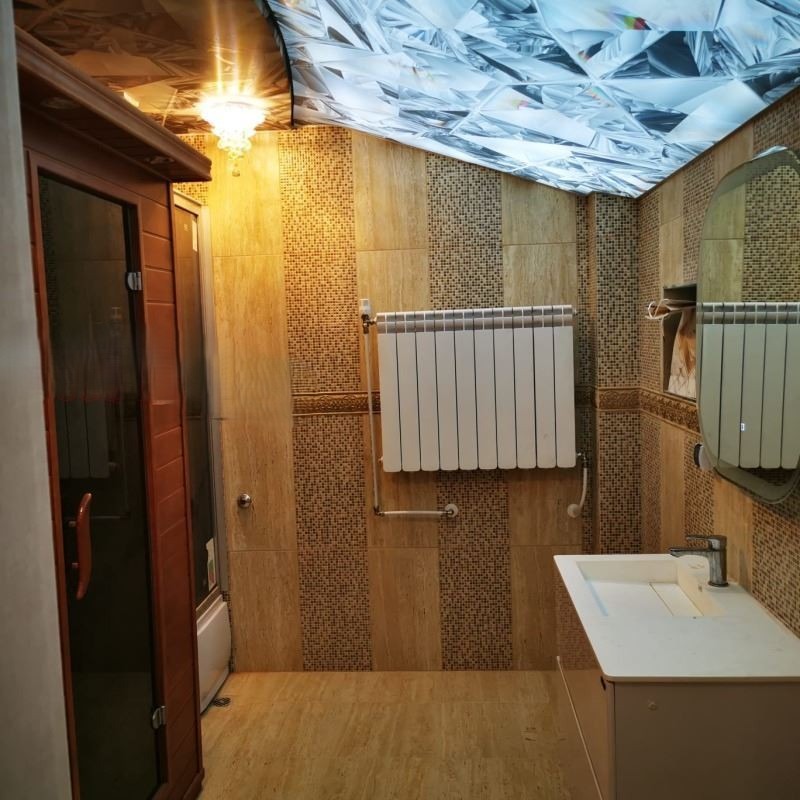Втори етаж - са разположени 3 спални две от тях с дрешници и едната със собствен санитарен възел със ел. сауна, баня/тоалет за етажа, панорамна тераса.