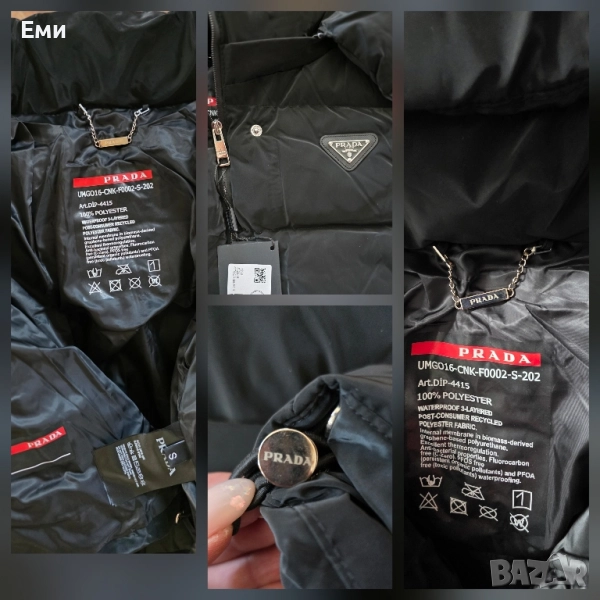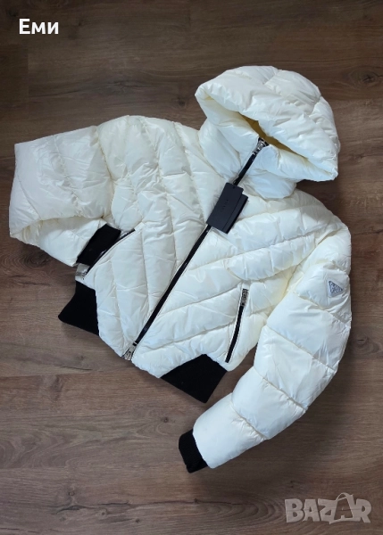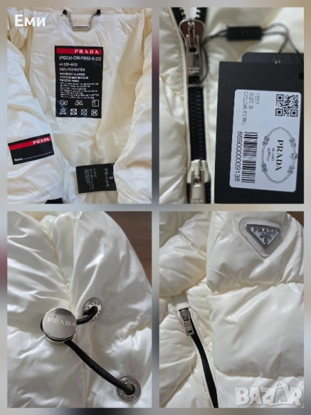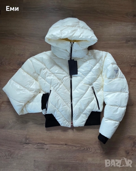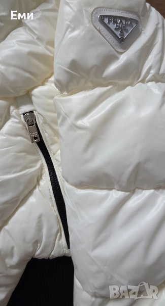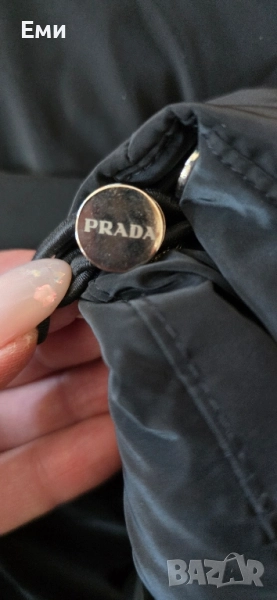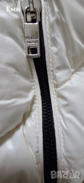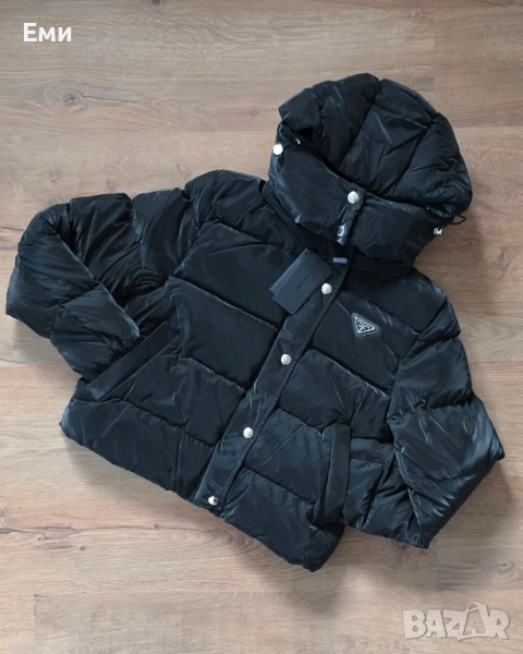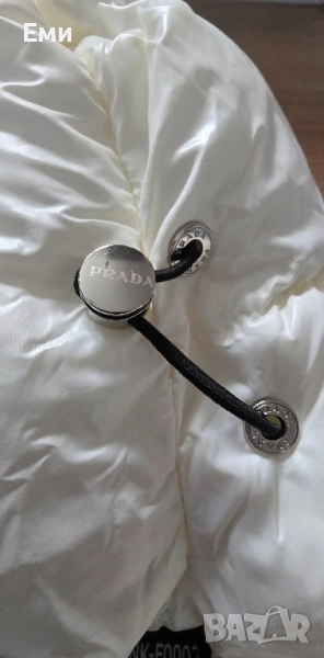 Дамски якета актуални прекрасни модели Prada най-високо качество с всички етикети. Връзките отдолу позволяват да се набира. Има качулка, сваляща с цип.