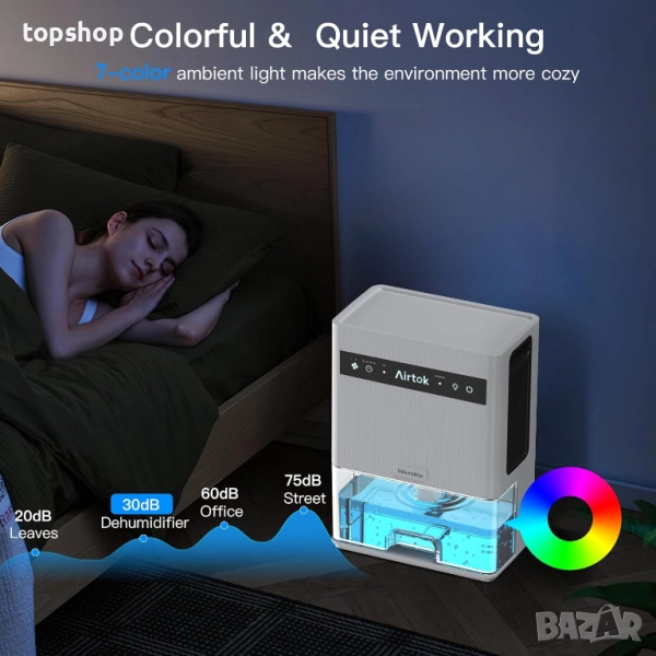 7-цветни нощни лампи: Влагоабсорбаторът има независим бутон за осветление, 7 променящи се лампички, може да служи като нощна лампа, създавайки приятна и романтична атмосфера за сън. А ултратихата работа (30dB) създава комфортна и спокойна среда за вашата спалня и офис.