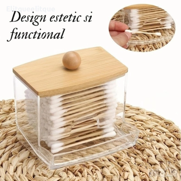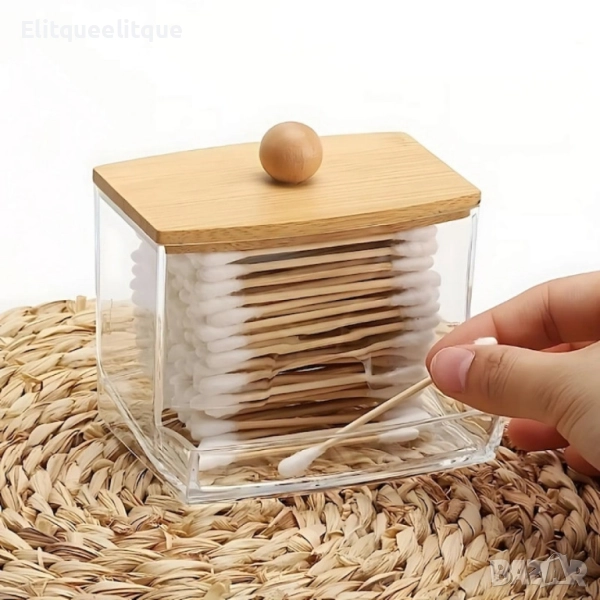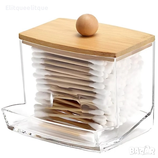 Материал: Прозрачна пластмаса и бамбук; Цвят: Прозрачен / Кафяв (дървесен); Размери: Компактен и удобен за малки пространства; Капак: Бамбуков с дървено топче за лесно отваряне; Форма: Правоъгълна с преден отвор за бърз достъп.