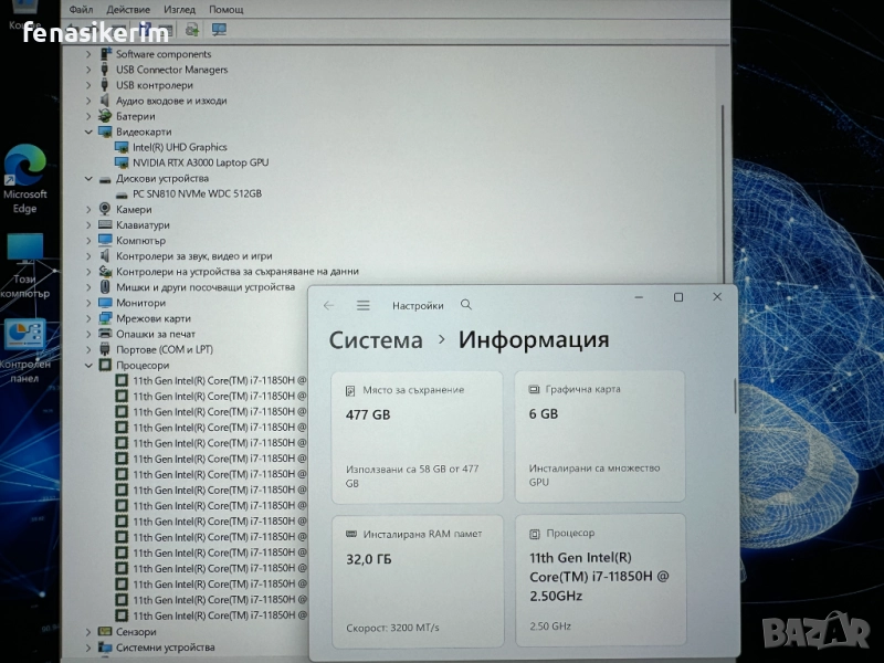 2 видеокарти : Nvidia RTX А3000 192bit 6GB DDR6 собствена памет + Intel UHD Video - up to 24 GB Total Graphics memory.