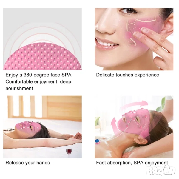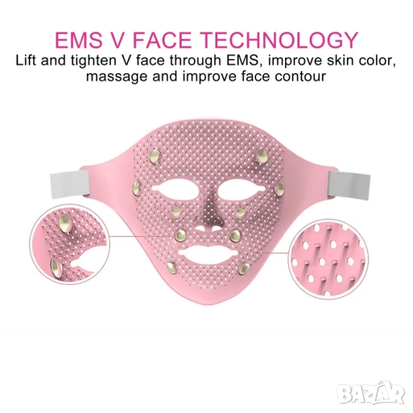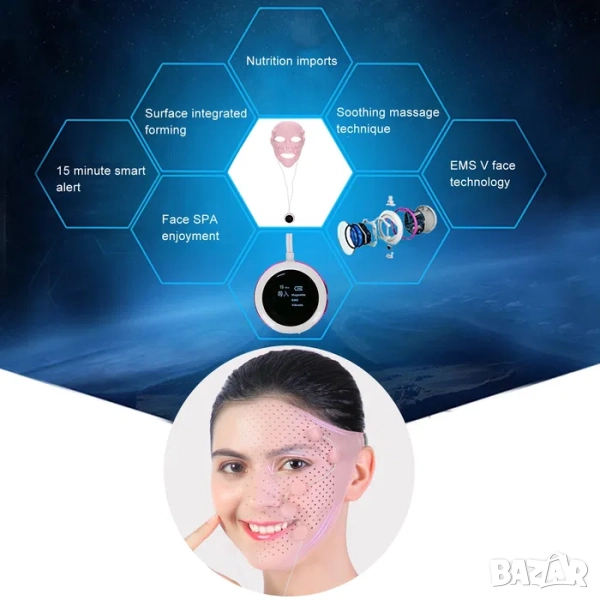 3D силиконова маска за лице се адаптира към формата на лицето, магнитните масажни глави имитират акупунктурен масаж. Използва технология за биологични вълни EMS и технология за имитация на успокояващ масаж, които могат напълно да повдигнат лицето и да отпуснат кожата.