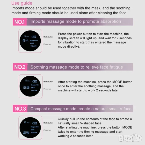 1. Позволява ви да се насладите на СПА за лице, точно както в салон. EMS V-образен масаж за лице, имитация на успокояващ масаж и въвеждане на серум за лице.