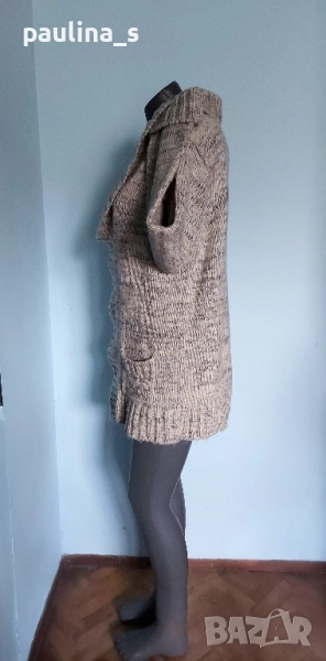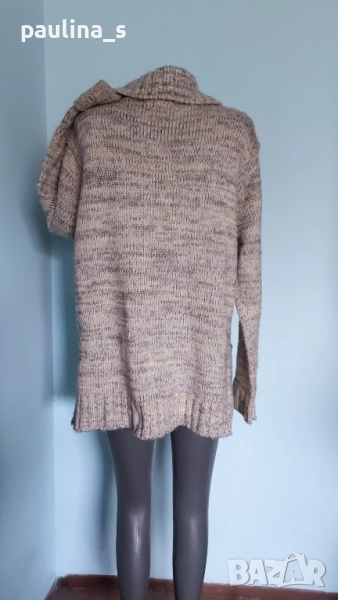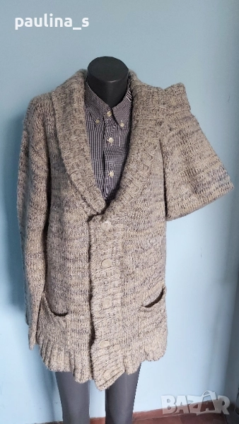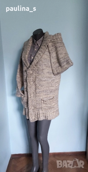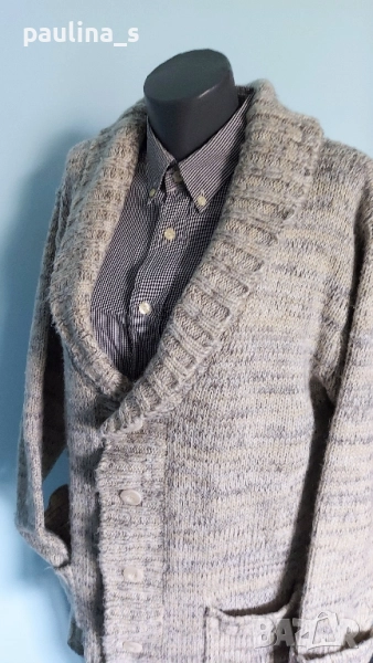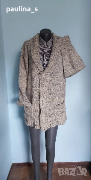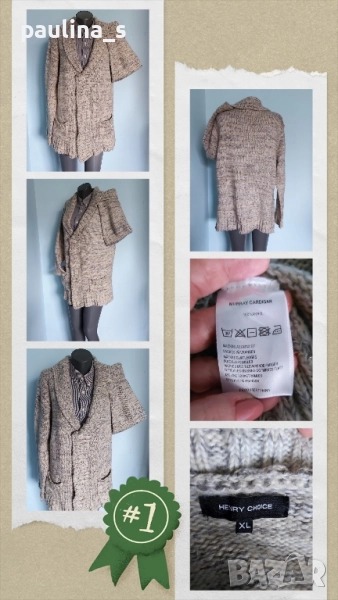 1️⃣. Колаж / Колаж / XL / 3XL - "Henry Choice". Цената е крайна, без пазарлъци 29,99лв / 15 евро. Кардиган тип жилетка с шал яка, копчета и външни декоративни джобове. Моделът е стои леко втален, не се вижда, защото е облечен на S дамски манекен. Преждата е меланж, дебела и много топли, не боцка. Без дефекти е, не е чисто нова. Една бройка е.