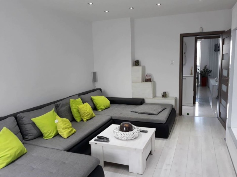 Имотът разполага с площ от 90кв.м / коридор, кухня с трапезария , всекидневна, две спални помещения, баня с тоалетна, отделна толетна, гардеробна, тераса и мазе. Жилището се предлага напълно обзаведено и е готово за живеене. Намира се в панелен блок, разположен на седми етаж и се отоплява на ТЕЦ. Имотът е подходящ както за лично ползване, така и за инвестиция.