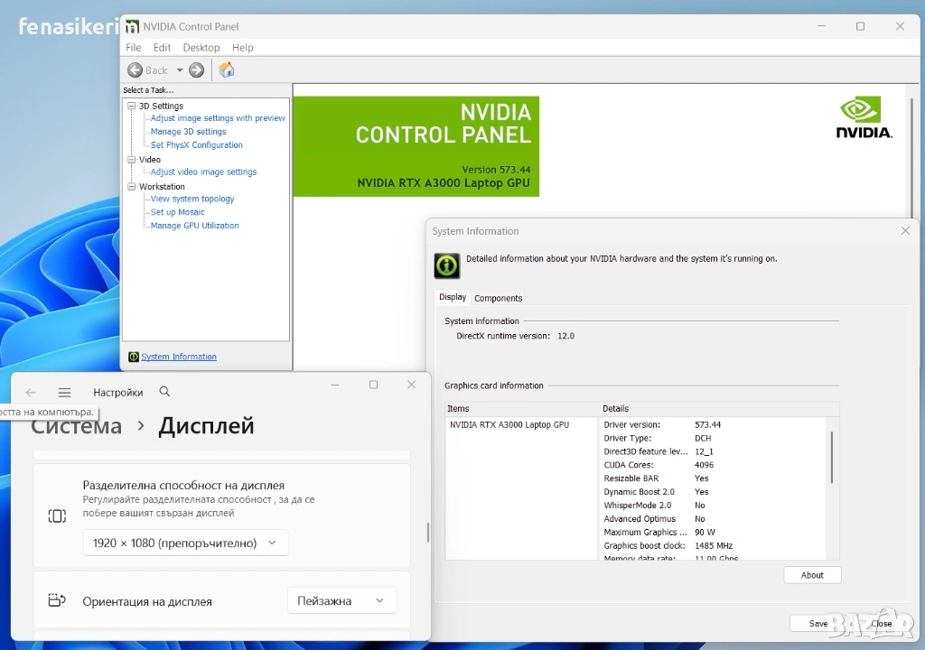 2 видеокарти : Nvidia RTX А3000 192bit 6GB DDR6 собствена памет + Intel UHD Video - up to 24 GB Total Graphics memory.