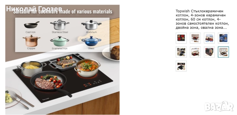 Topwish Стъклокерамичен котлон, 4-зонов керамичен котлон, 60 см котлон, 4-зонов самостоятелен котлон