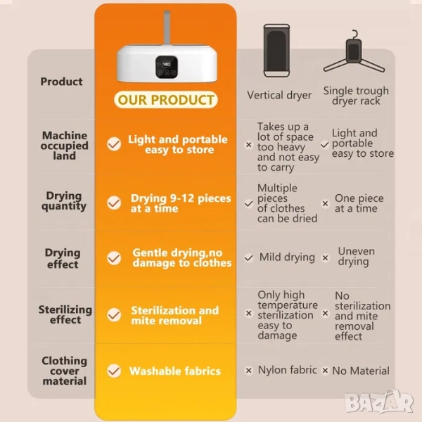 【Интелигентен контрол: 】С помощта на интелигентна сензорна технология той автоматично контролира температурата и влажността, за да гарантира, че дрехите са в най-добро сухо състояние.