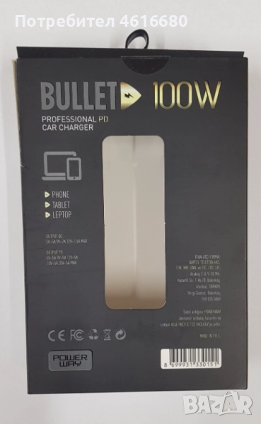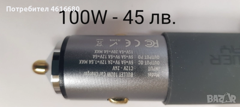 за кола 100W BULLET - 2 изхода USB / TYPE C