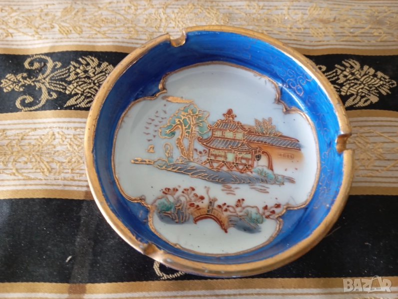 Пепелник, най-вероятно японски, в стил Satsuma. Той е украсен със синя глазура и златни акценти, а в центъра му е изрисуван пейзаж с традиционна сграда, дърво и мост.