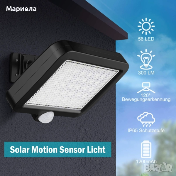 Тази лампа е комбинация от соларен прожектор и лампа със сензор за движение. Обновеният PIR сензор за движение открива хора на разстояние 3-5 м (при засечено движение, соларните лампи ще се включат автоматично, а ако не се засече движение, ще се изключат автоматично). Тя ще отговори на вашите разнообразни изисквания.