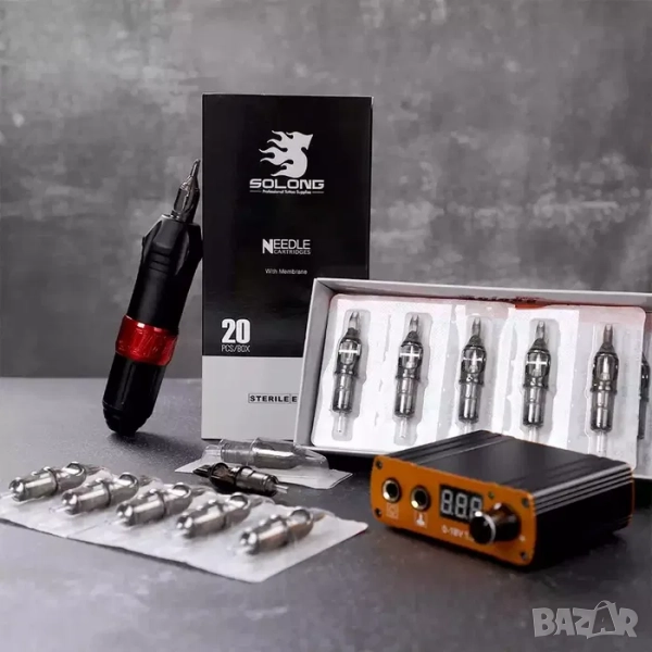• Ротационен комплект за татуировки, включващ: машина за татуировки; 20бр картридж игли; захранващ кабел; 6 мастила: педал и други аксесоари.