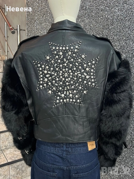 Черно дамско яке от еко кожа с еко косъм на ръкавите, ефектен гръб и топла подплата. Размери S, M, L.