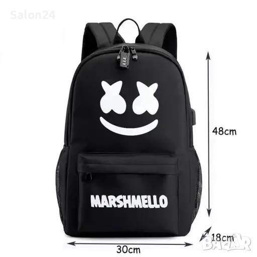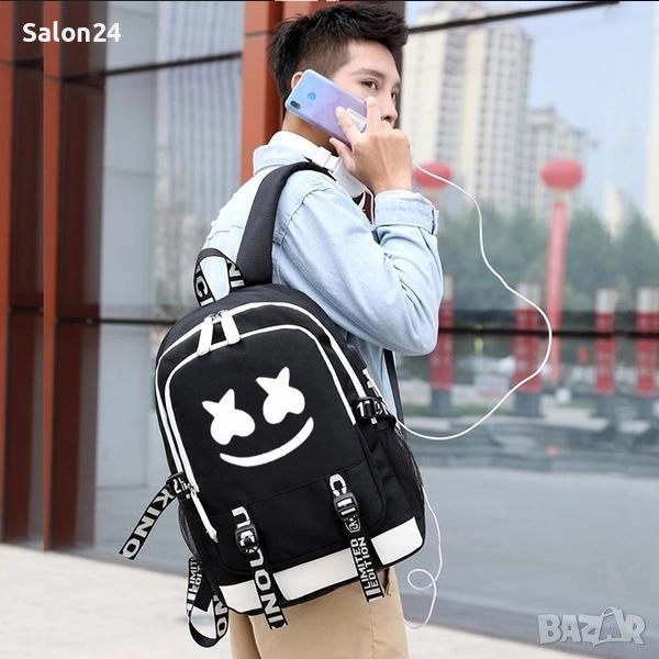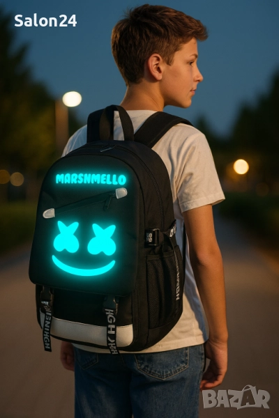 Светеща ученическа раница Marshmello с USB и AUX преходници → Обява 52213391