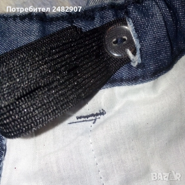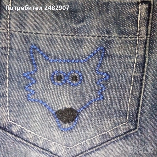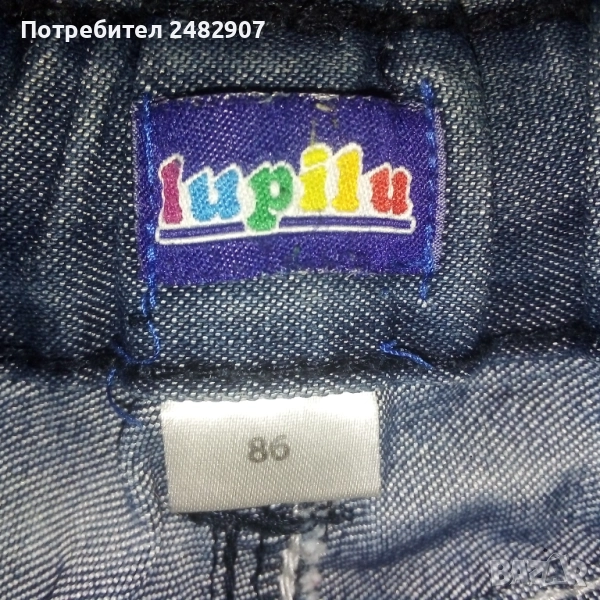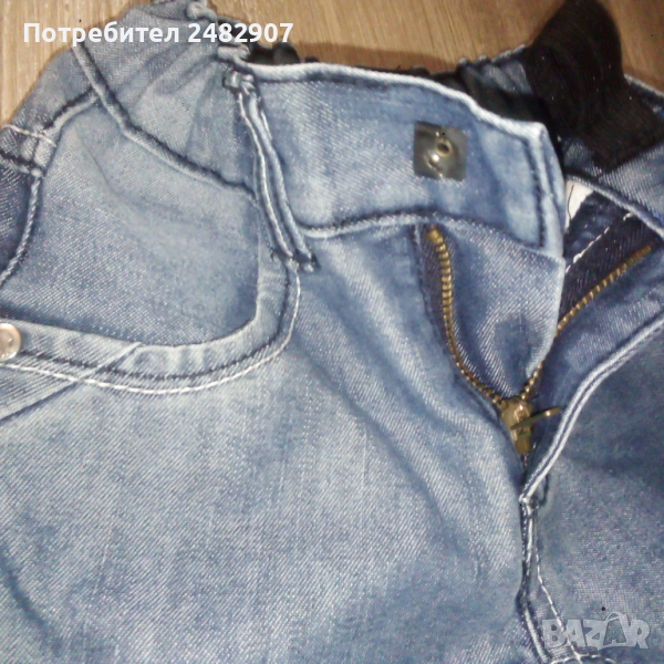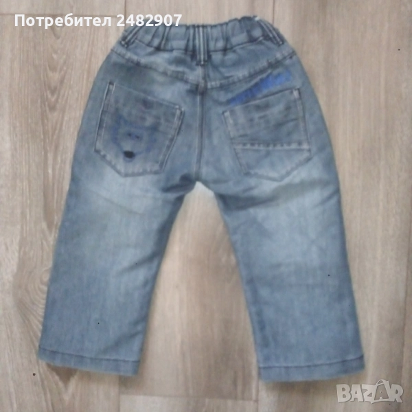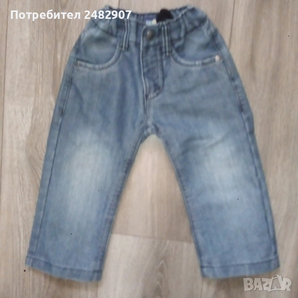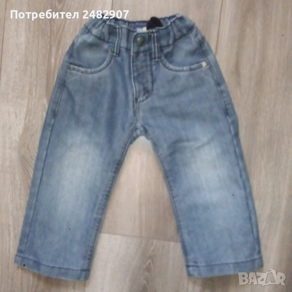 Тъмно сини бебешки дънки за ръст - до 86 см. Съдържат 58 % памук и 42 % полиестер. Ширина в талията - 18 см, дължина от талията до чатала - 16,5 см, дължина от талията до долу - 47,5 см, ширина на крачола в долната част - 14 см. Много запазени, почти не са използвани, без забележки, с регулируем ластик в талията.