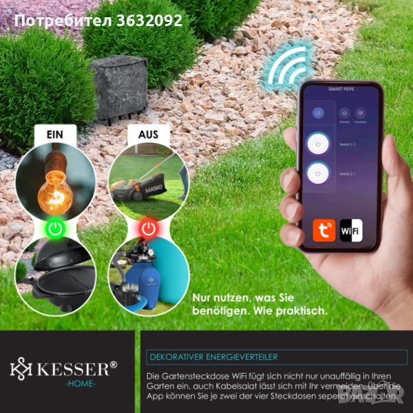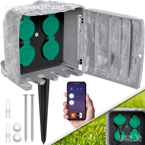 Външен разклонител за градина с четири контакта, скрит в кутия, наподобяваща камък. Може да се управлява дистанционно чрез приложение за смартфон.