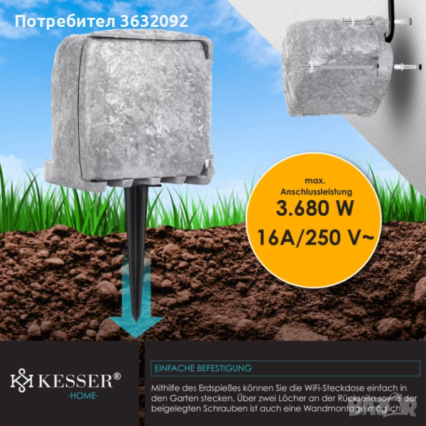 В комплекта са включени колче за забиване в земята и винтове за монтаж на стена.
