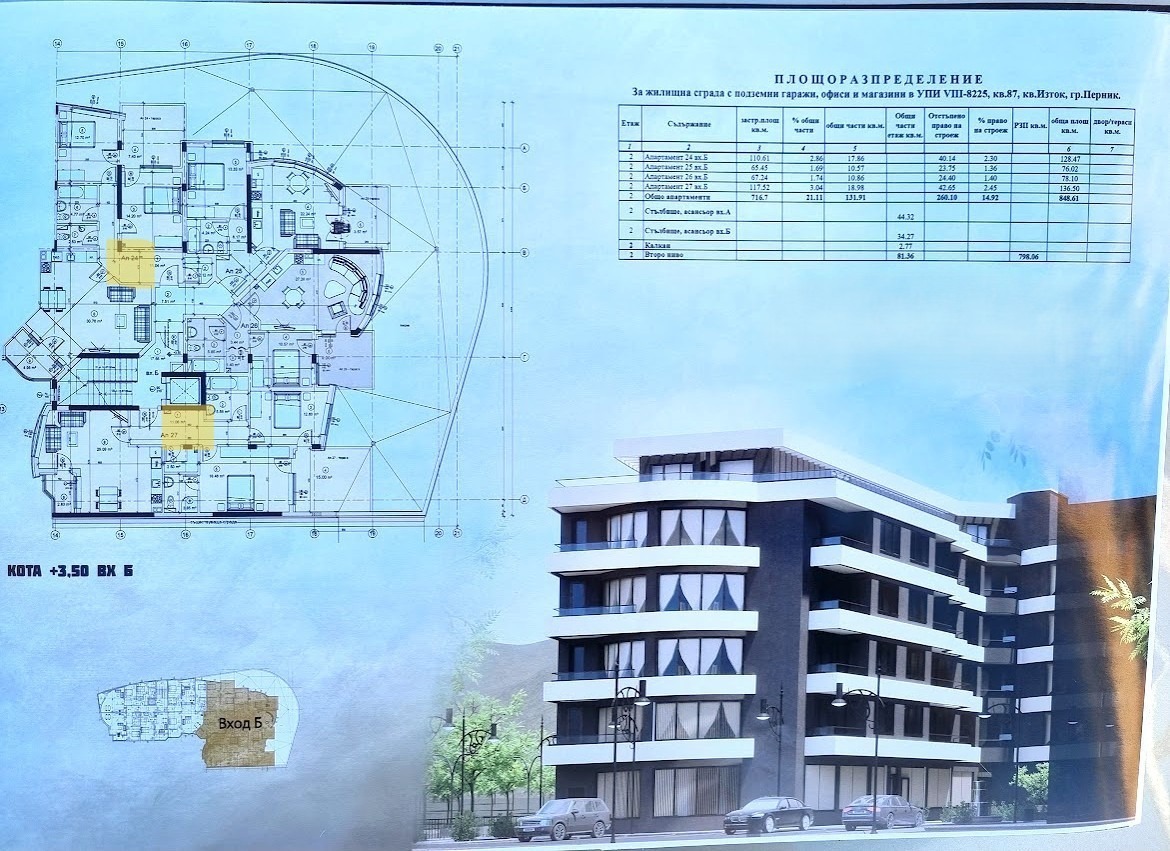 ✅ Жилищната сграда е проектирана на 6 етажа, с два входа, състояща се от общо 42 апартамента двустайни и тристайни, мазета, подземни и надземни гаражи единични и двойни, помещения за велосипеди и за детски колички.