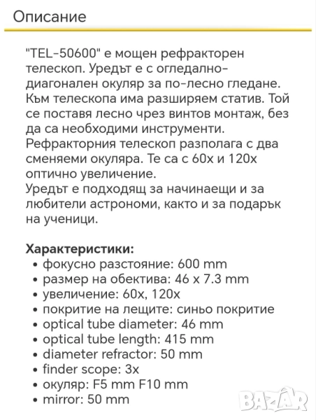 Рефракторен телескоп TEL 50600, VIVITAR, телескоп за деца с тринога, статив в много добро състояние, това което е видимо на снимките. Повече информация в снимките.Еконт, Спиди, лично предаване. Телефон за връзка 0885776829.