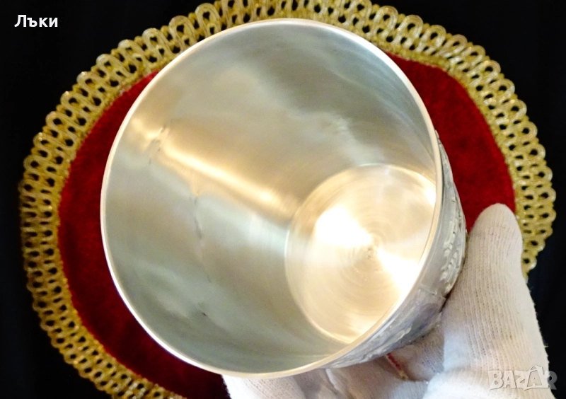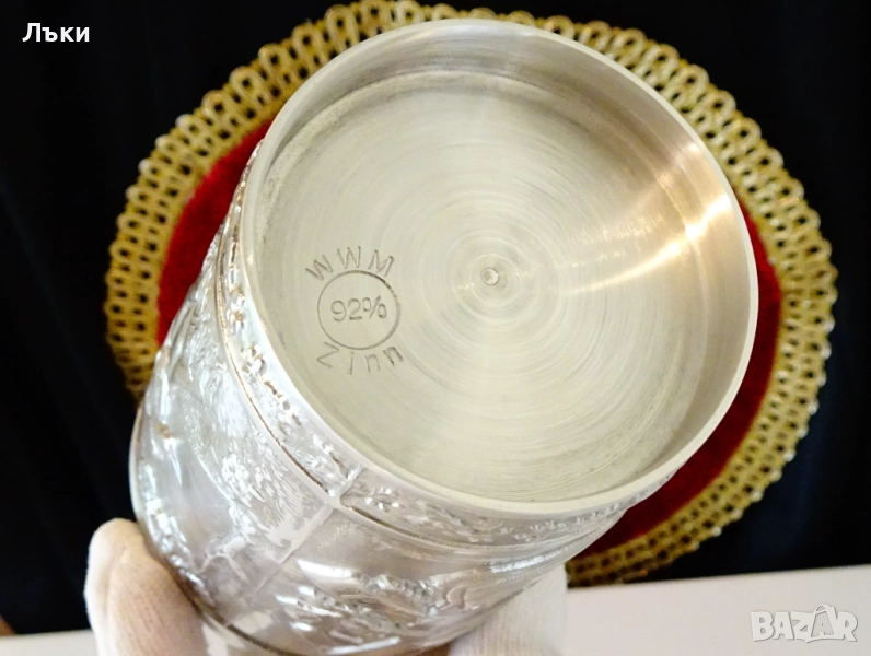 изработка от 95% калай и 5% сребро,маркирана от производителя.Декорирана с три