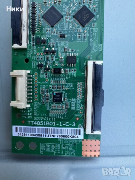T-Con TT4851B01-1-C-3 от телевизор Samsung UE49K5602AK. Платката е работеща и свалена от работещ телевизор със счупен дисплей. Модела на дисплея еCY-KK049BGHV2H.Изпращам по ЕКОНТ с опция тест и преглед!!! С оглед и проба на това, че модулите нямат гаранция, след прегледа, теста и заплащането не приемам възражения и ракламации, щото предварително всички платки и модули са тествани и в изправно състояние се пращат!!!