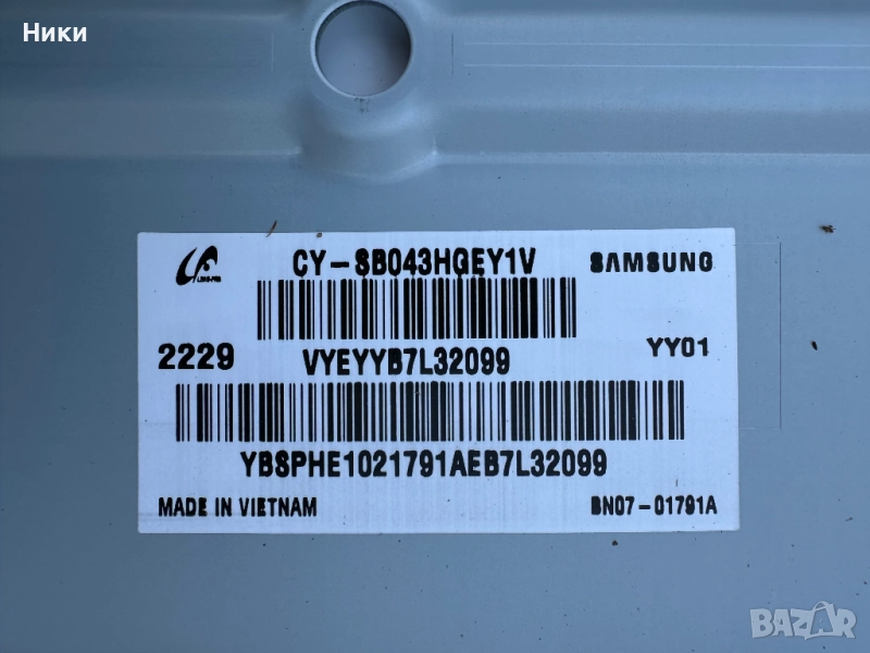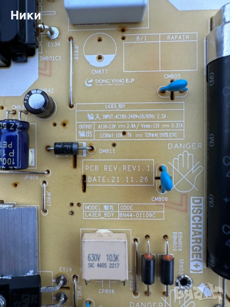 Power Board BN44-01109C / L43E6_BDY от телевизор Samsung UE43BU8072U Платката е работеща свалена от работещ телевизор със проблем в дисплея както се вижда и на снимките модел на дисплея е CY-SB043HGEY1V. Изпращам по ЕКОНТ с опция тест и преглед!!! С оглед и проба на това, че модулите нямат гаранция, след прегледа, теста и заплащането не приемам възражения и ракламации, щото предварително всички платки и модули са тествани и в изправно състояние се пращат!!!