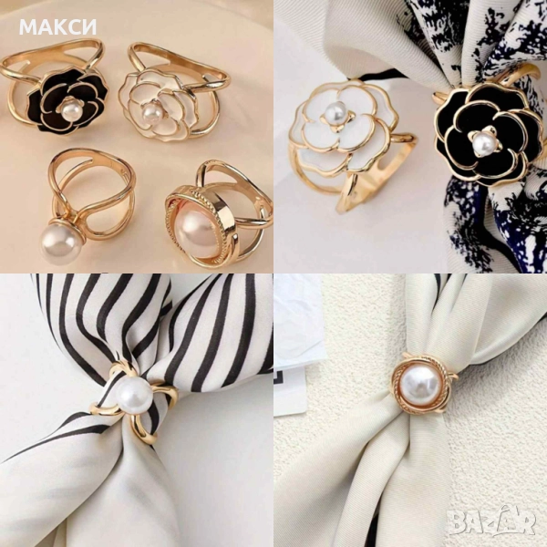 Прекрасен елегантен комплект от 4 бр. пръстена за шалове и др. с перли в златисто → Обява 52217743