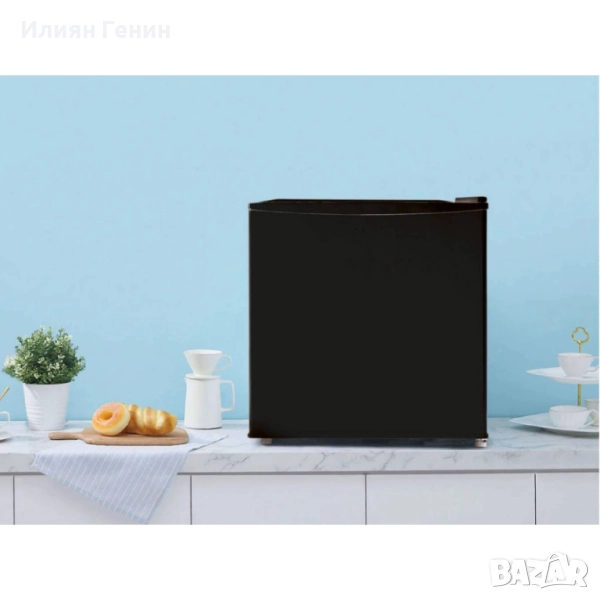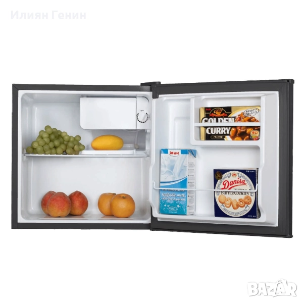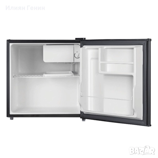 Малък, но мощен хладилник, идеален за кухненски боксове или офиси. Пантите могат да се монтират от двете страни. С 2 рафта на вратата. С фризер. Със затворен гръб. Регулиране на температурата. Обем: 43 литра. Технически данни: Клас на енергийна ефективност: E. Годишна консумация на енергия: приблизително 80 k Wh. Ниво на шум: приблизително 41 dB B. Размери: приблизително 49,2 x 47,2 x 45 см. Тегло: приблизително 14,7 кг.