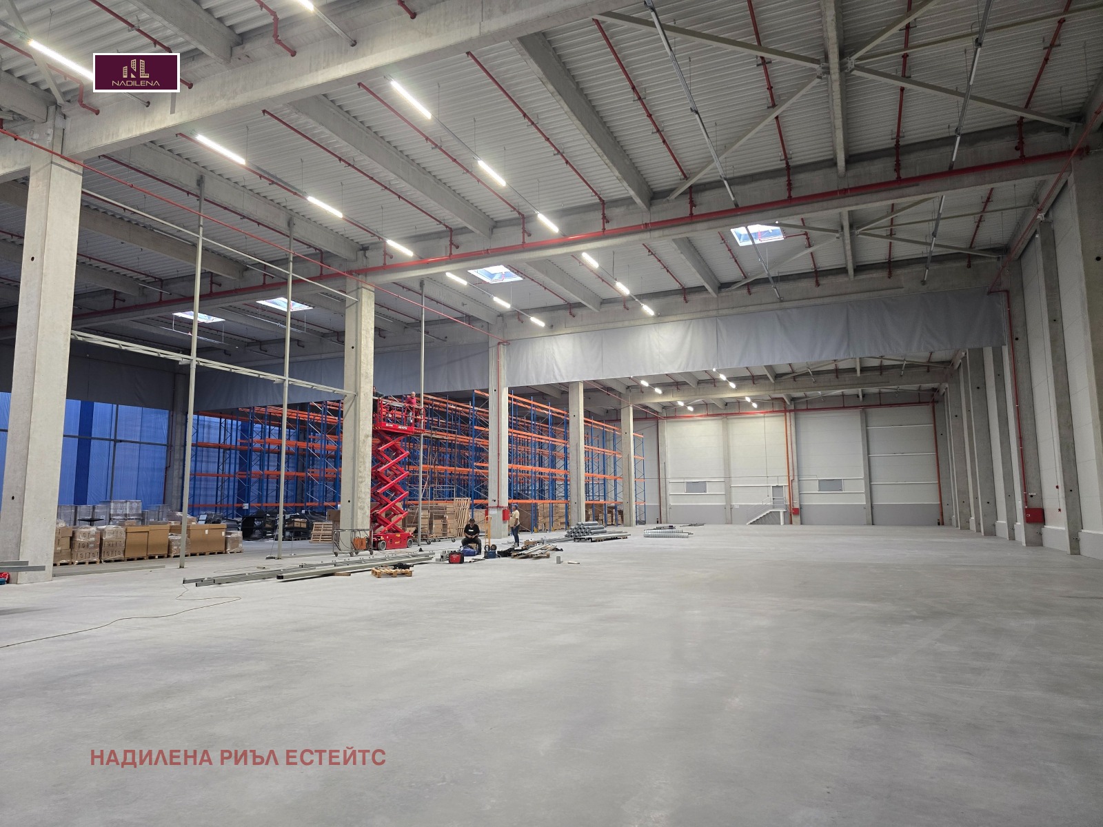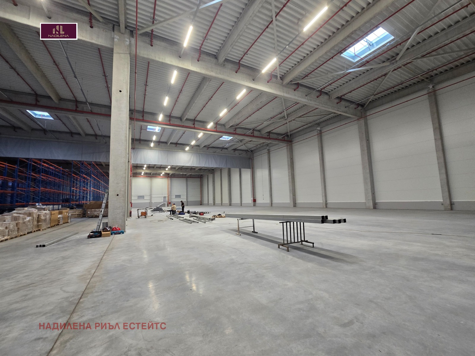 Светла височина-10.5метра, настилката е шлайфан бетон с товаропоносимост на пода от 5т/кв.м.