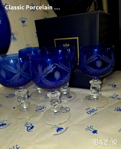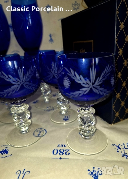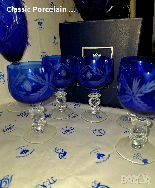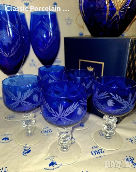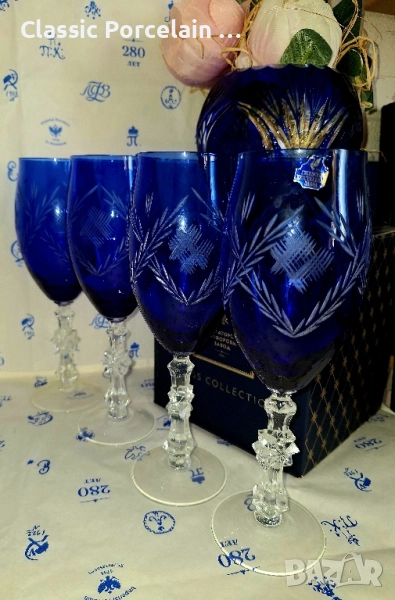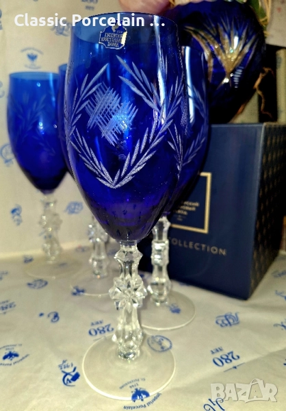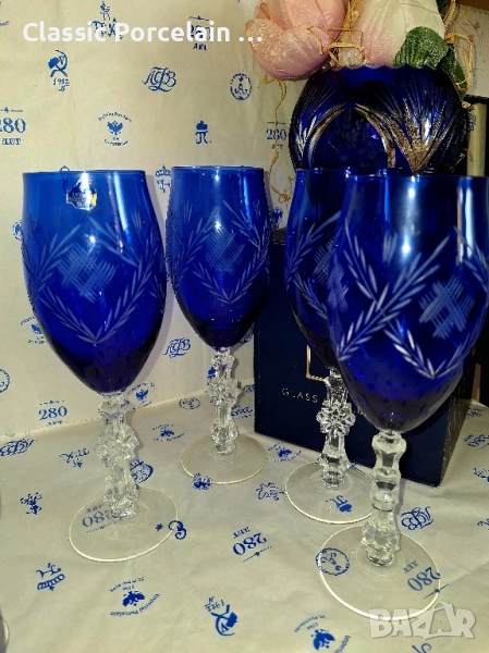 кристал – съчетание на традиция, стил и изисканост. Всеки детайл носи духа на майсторската изработка, а фините балончета подчертават автентичността на ръчния труд. Модели: • 1 бр. чаша за вино/вода – 420 мл Цена: 60 лв / 30,70 € • 4 бр. чаши за вино – 330 мл Цена: 85 лв / 43,50 € за брой • 5 бр. чаши за аперитив – 150 мл Цена: 45 лв / 23,00 € за брой Произход: Гусевска Имперска Фабрика, СССР Материал: кобалт и кристал Цвят: дълбок кобалт – символ на лукс и елегантност Подходящи за подарък, колекция или специални поводи – защото истинският стил личи във всеки детайл.