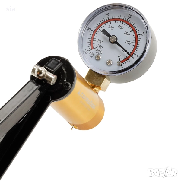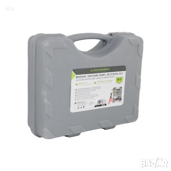Ръчна вакуумна помпа, комплект за обезвъздушаване. Този комплект ви позволява да диагностицирате всички двигатели с вътрешно горене, както дизелови, така и бензинови, в почти всеки двигател или система. Използва се за обезвъздушаване на спирачната система и за проверка на правилната работа на системата за подаване на гориво, сензорите за налягане, клапана за рециркулация на отработените газове, дроселовата клапа, регулатора на налягането на горивото, модулатора на налягането в автоматичните трансмисии, усилвателя на спирачките и др. Манометърът ви позволява бързо и точно да проверите нивото на компресия в двигателите. Благодарение на аксесоарите, той е подходящ за всички леки автомобили.