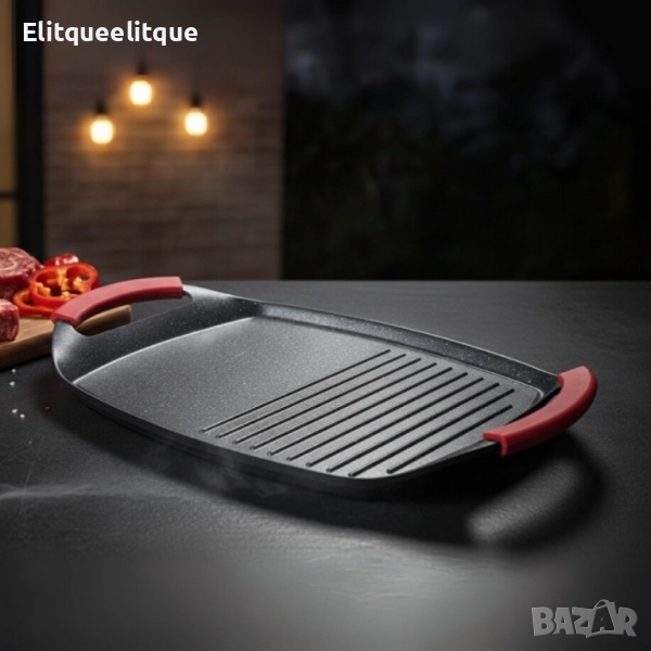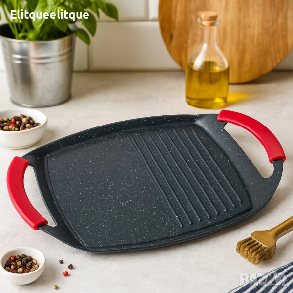 Продукт: Печаща плоча QUEEN ATG47M, 47 см, незалепващо покритие; Основен проблем: Залепване, трудна поддръжка и липса на „барбекю“ резултат у дома; Решение: Двойна повърхност (грил + гладка), незалепващо покритие, съвместимост с всички котлони и фурна, съдомиялна; Функции: оребрена зона, гладка зона, силиконови дръжки, равномерно нагряване; Допълнителни ползи: антибактериална повърхност, голям размер 47 см, лесно почистване. Модел: QUEEN ATG47M; Размер: 47 см (работна дължина), подходяща за приготвяне на няколко порции едновременно; Покритие: незалепващо, лесно за почистване; описано като антибактериално; Съвместимост: всички видове котлони, вкл. индукционни; подходяща за фурна; Поддръжка: съдомиялна машина – да; Безопасност: силиконови дръжки за сигурен, хладен захват.