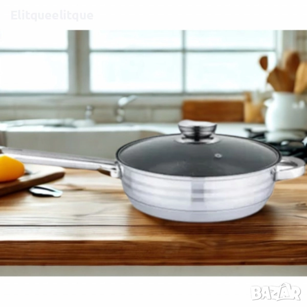 Марка: Bohmann; Модел: BH-71241-24T; Диаметър: 24 см; Дълбочина: 7.5 см; Капацитет: 3.4 л; Материал: Неръждаема стомана с тефлоново покритие; Капак: Закалено стъкло с отвор за пара; Съвместимост: Всички видове котлони, включително индукционни; Лесен за почистване и поддръжка.