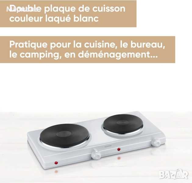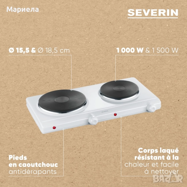 Две нагревателни чугунени плочи с независими термостати и индикатори с размери 1 x 15,5 см в диаметър 1000 W и 1 x 18,5 см в диаметър 1500 W, плавно регулиране на температурата .