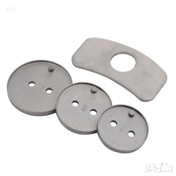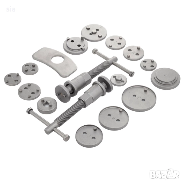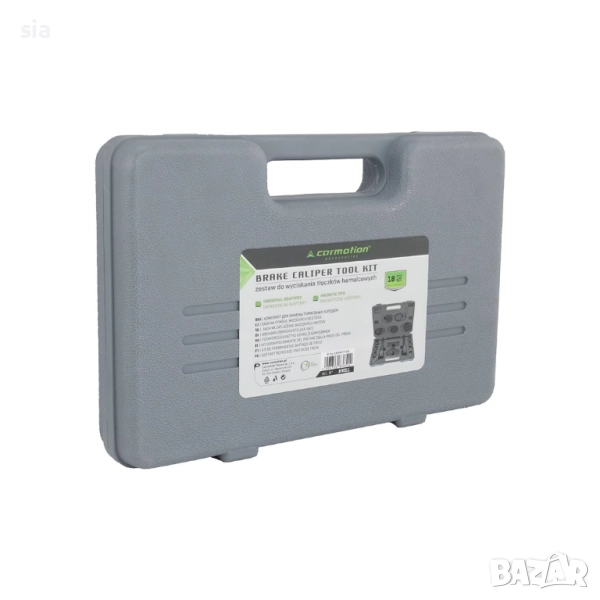 Този комплект за пресоване на спирачни бутала от 18 части е идеалното решение за всички автомобилни ентусиасти и професионалисти, търсещи надеждни инструменти за ремонт на спирачната система. Комплектът е подходящ за повечето автомобили на пазара. Целият комплект е опакован в удароустойчив, лесен за носене пластмасов калъф. Копчето е снабдено с магнитен връх, който държи плочата, съответстваща на даденото бутало, подравнена.