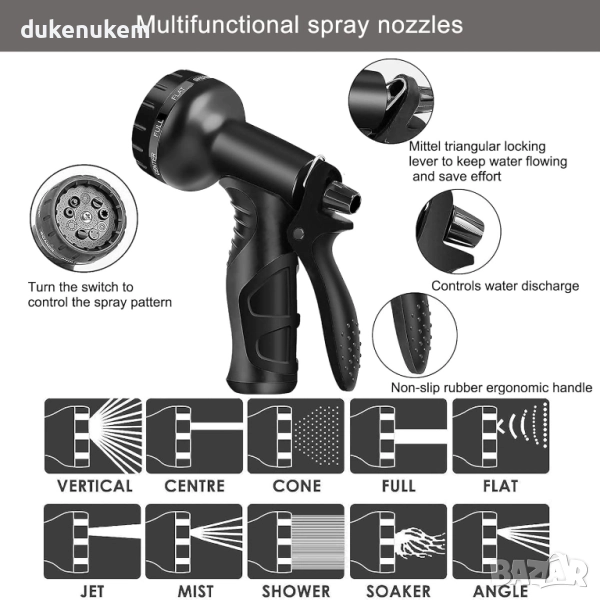 10-режимен пистолет за пръскане – различни струи за поливане на градина, миене на кола, под, двор или домашни любимци.