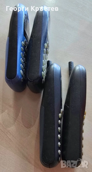 Горния ред, двата сини, светло син и тъмно син, работят. Св.синия е ОК, работи идеално, тестван с А1, нямам друга за проба, зарежда си батерията, клавиатура, подсветка, слушалка, микрофон, всичко е ОК, има БГ меню, клемите са ОК, много добър външен вид, тъмно синия също работи идеално, тестван с А1, нямам друга за проба, зарежда си батерията, клавиатура, подсветка, слушалка, микрофон, всичко е ОК, няма БГ меню, отпред добър външен вид, отзад панела не е ОК, има някакви дупчици, вижда се на снимките, проблема тук е, че едната клема, горната, откъм батерията е паднала, счупена е, но не е загубена, може да се запои и да е ОК, сега само я поставям, батерията я притиска, прави контакт и работи идеално.