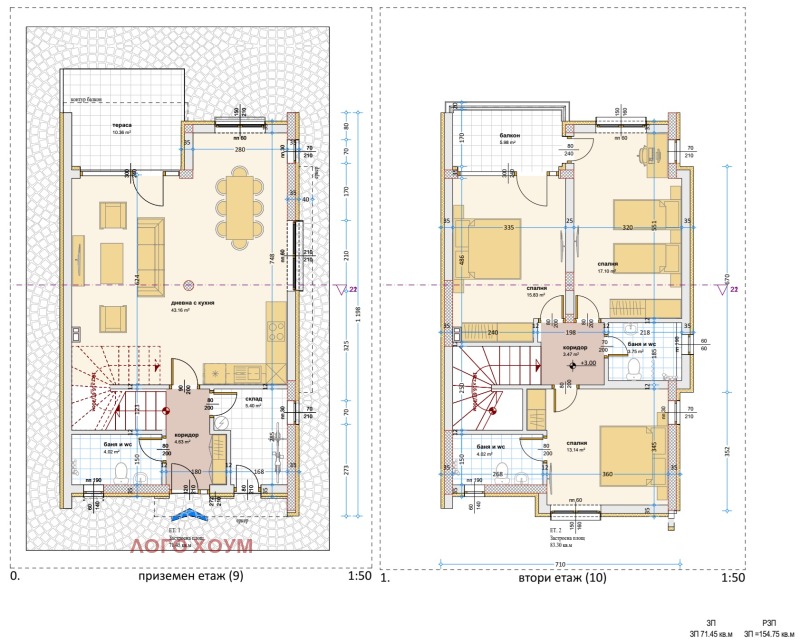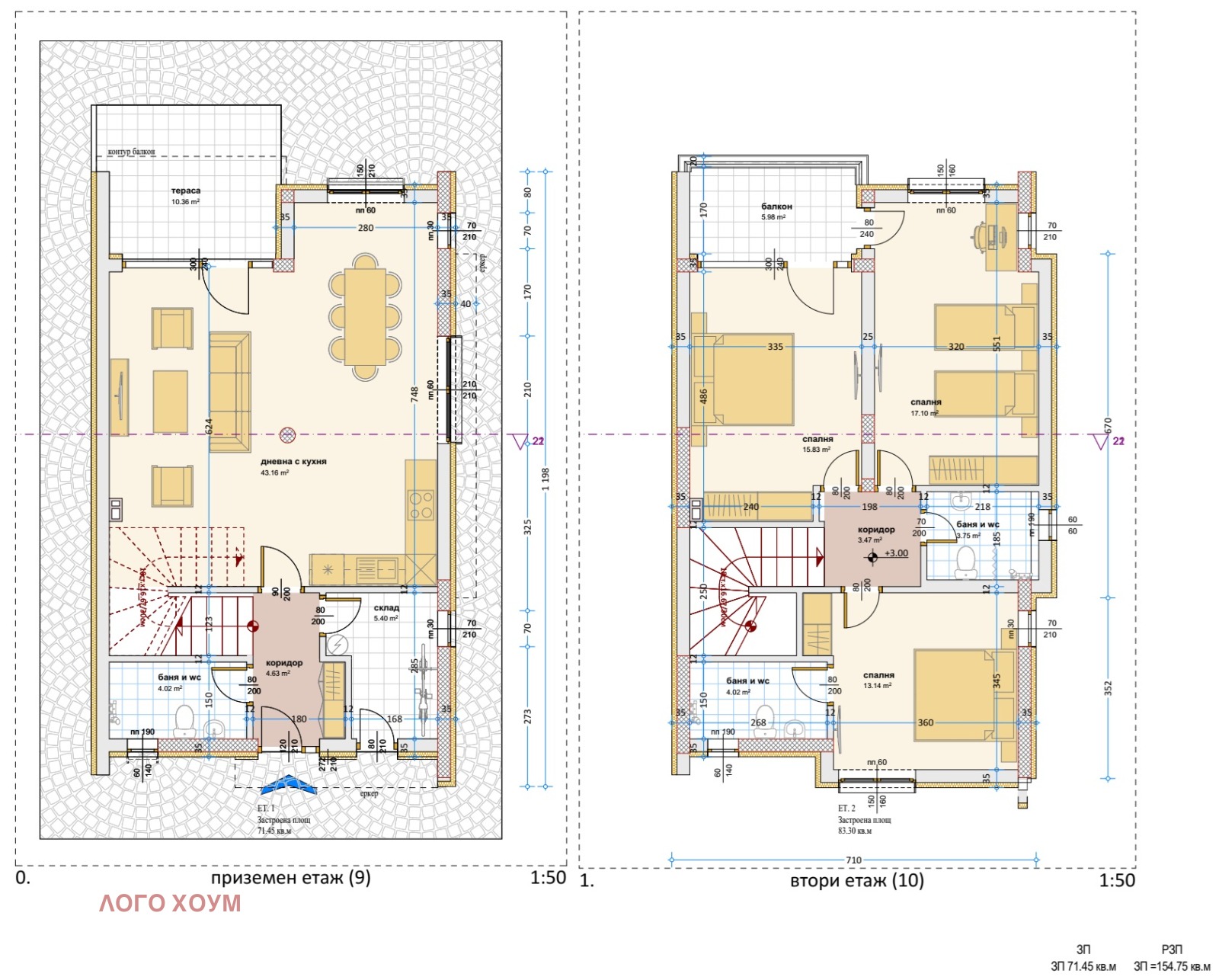 Къща 10 с площ от 154,75м2 и двор - 244 м2 , на 2 етажа: