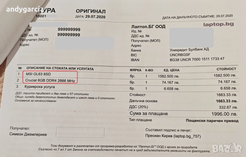 - изтекла гаранционна карта + фактура за 2000лв., като е заплатено допълнително да е с 16гб рам.
