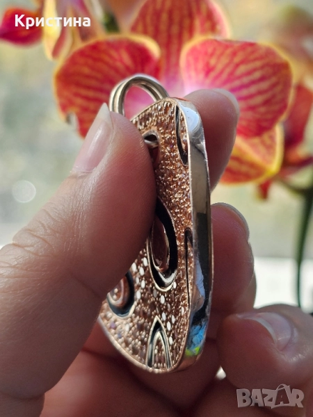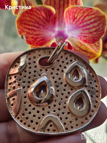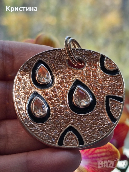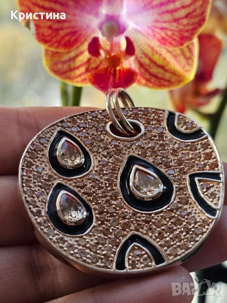 Нов прекрасен сребърен медальон в ХХЛ размер, с розова позлата. Камъните са ковани, в цвят шампанско, черното е емайл. Проба: 925. Масивен: 25 гр. Диаметър: 4.5 см.
