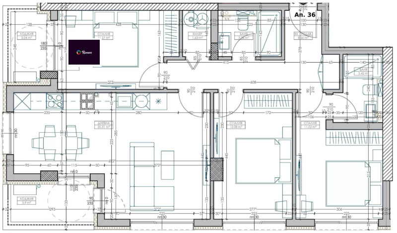 Разпределението е функционално, помещенията са с правилни форми, което улеснява проектирането и реализирането на интериорните решения.