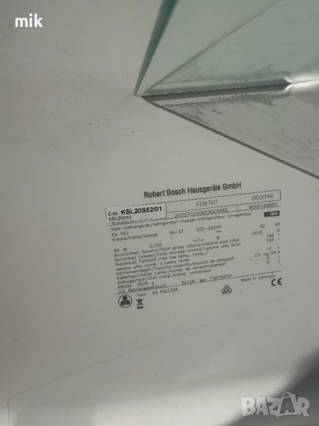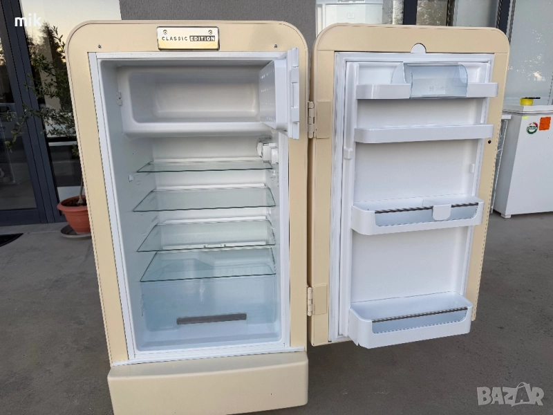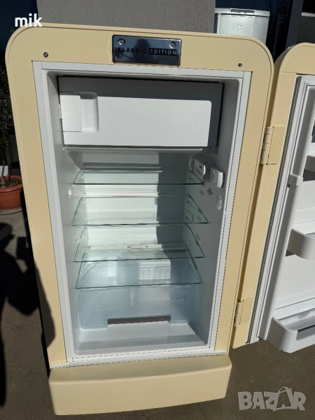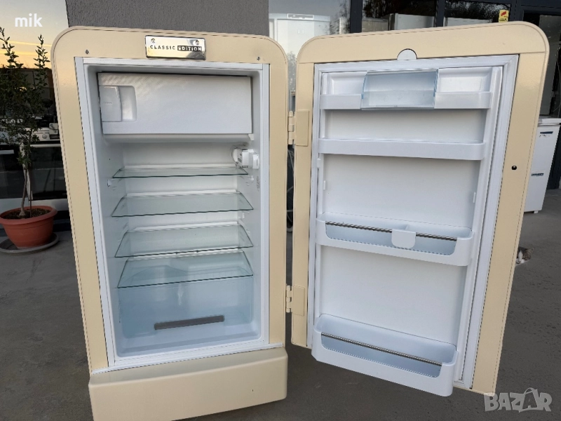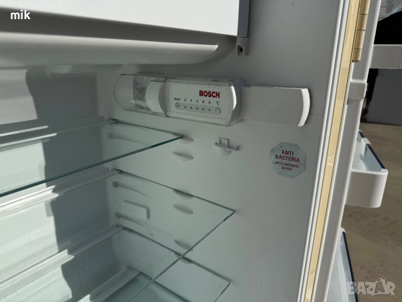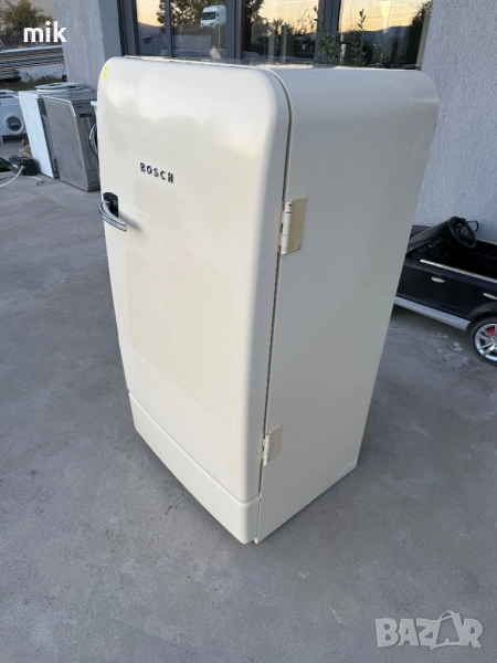 Ретро хладилник с камера Bosch. Цвят - Крем. Размери 128-65-65. Много запазен външен вид. Перфектни меки и бели уплътнения. С анти - бактериално покритие. Електронен термостат за настройване на температурата. Оригинално оборудване. Произведен и Закупен от Германия. Обем 166 литра. Много тих и икономичен компресор - 90W.