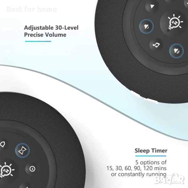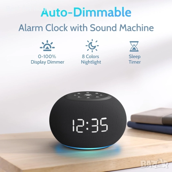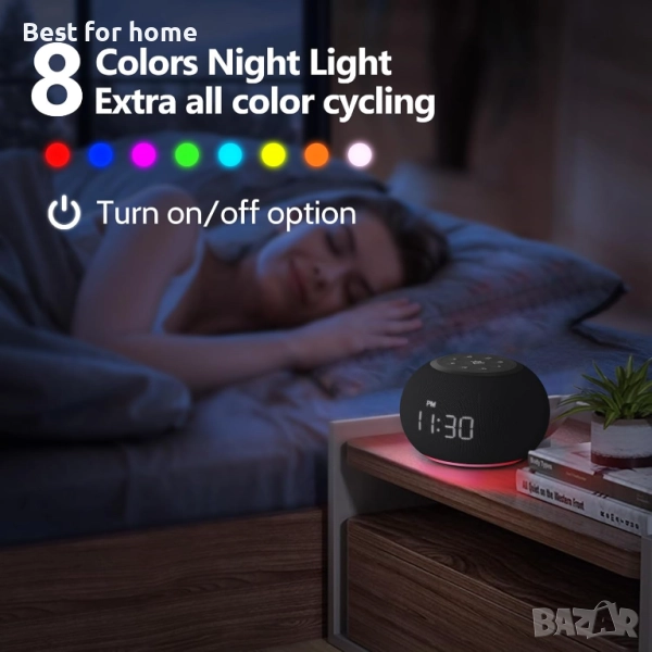 Будилник с автоматично затъмняване и звукова машина с комбинирано устройство за нощна светлина. Подобреният драйвер предлага 30 нива на настройка на силата на звука за прецизен контрол, създавайки комфортна и спокойна атмосфера за сън. Събудете се с нежни звуци от природата.