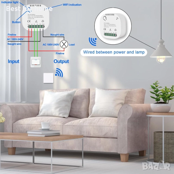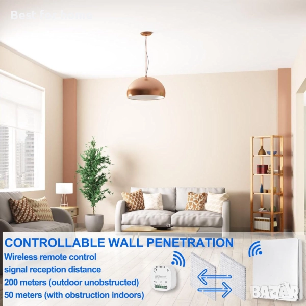 Обхват 50 м: 433 MHz RF радио превключвател работи през прозорци, врати, стени и тавани, като същевременно не пречи на други електронни устройства. Стабилна и надеждна работа с висока чувствителност на приемане (>-97dBm). Максималното разстояние на предаване е приблизително 200 м на открито (без препятствия) и приблизително 50 м на закрито.