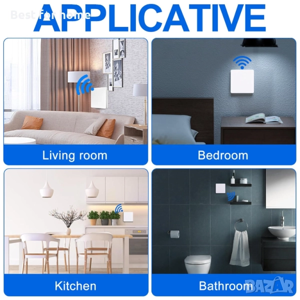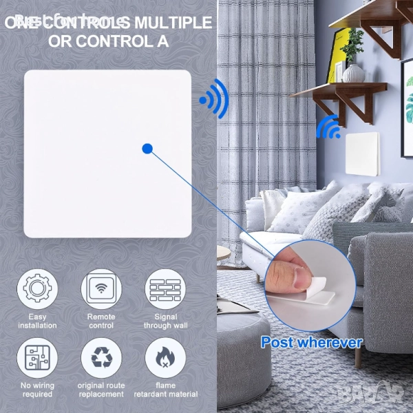 Мултиплейър контрол: всеки приемник може да контролира множество безжични превключватели. Така че можете да споделяте превключвателите със семейството. Можете да свържете устройството към приемника чрез дистанционно управление. И един предавател може също да контролира множество приемници. Например, 1 превключвател на стената до вратата на спалнята и друг на нощното шкафче.
