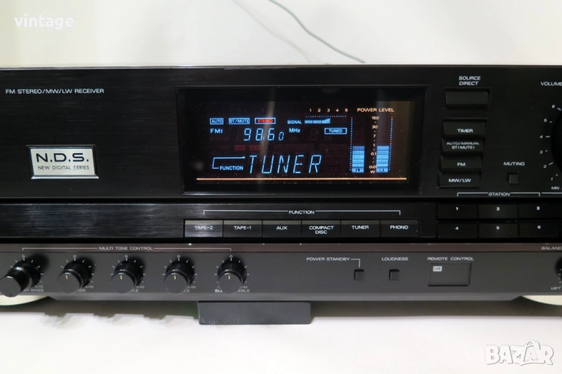 Транзисторен стерео ресийвър, отличен технически, много добър външен вид (една от малките врътки не е оригинална) Корекции: bass, super bass, middle, treble, super treble, loudness, source direct. Индикатор за изходните нива, дистанционно управление не е налично. Приложените снимки и видео са реални!