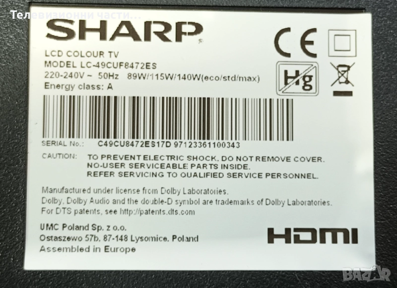 Sharp LC-49CUF8472ES със счупен екран LY.4YE01G001 LSC490FN02-H03/T.MS6488E.U703/PW.188W2.711
