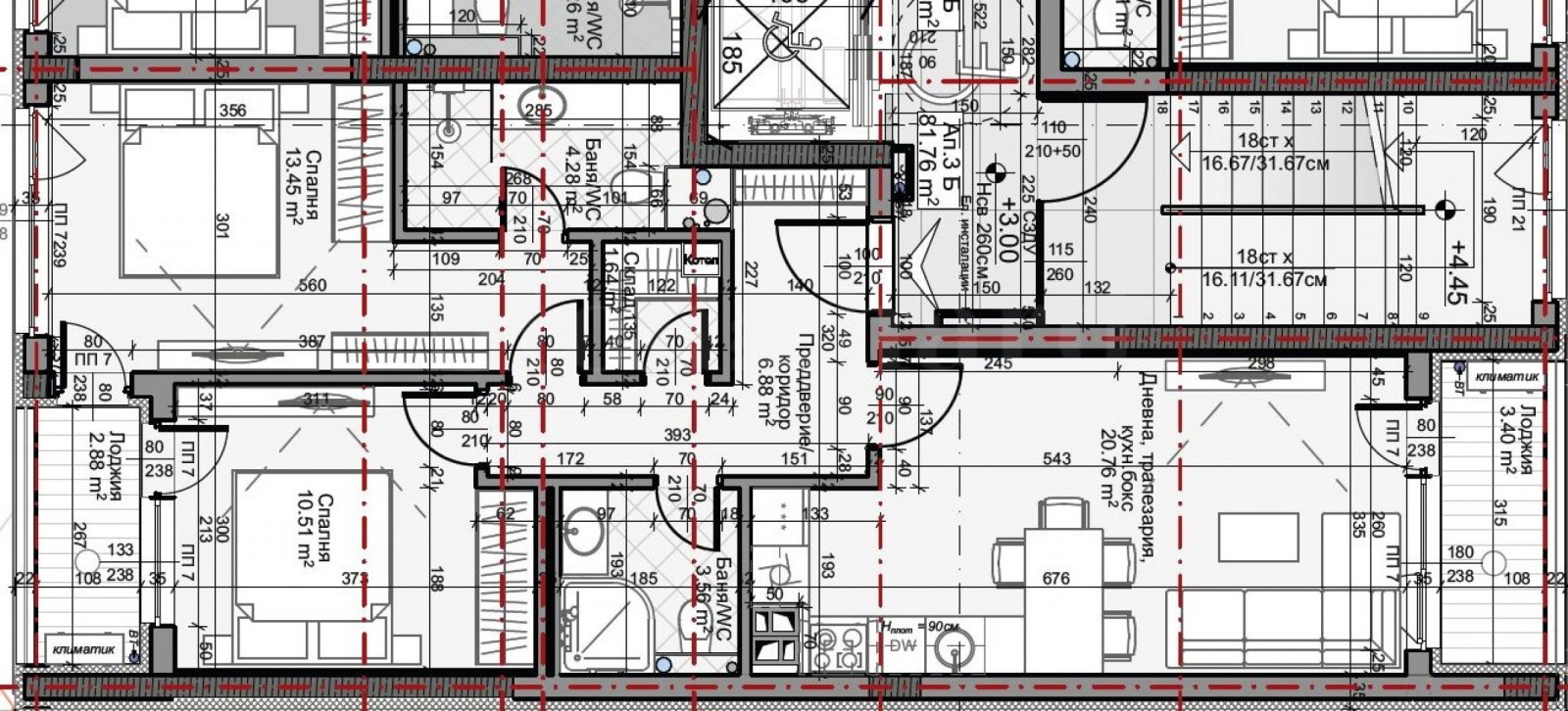 Апартаментът е тристаен, с обща площ 96.50 кв.м. (нетна площ 81.76 кв.м. + общи части 14.74 кв.м.) и е разположен на втори етаж.