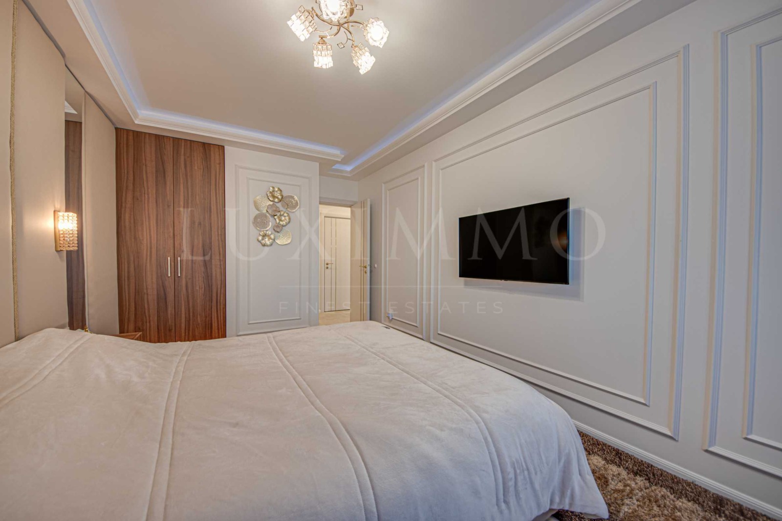 Интериорът е завършен с висококачествени материали - мрамор, дърво и оникс, подбрани модерни мебели, акценти в златно, атрактивни осветителни тела и електроуреди от най-висок клас. Отоплението е решено с подово отопление на газ.